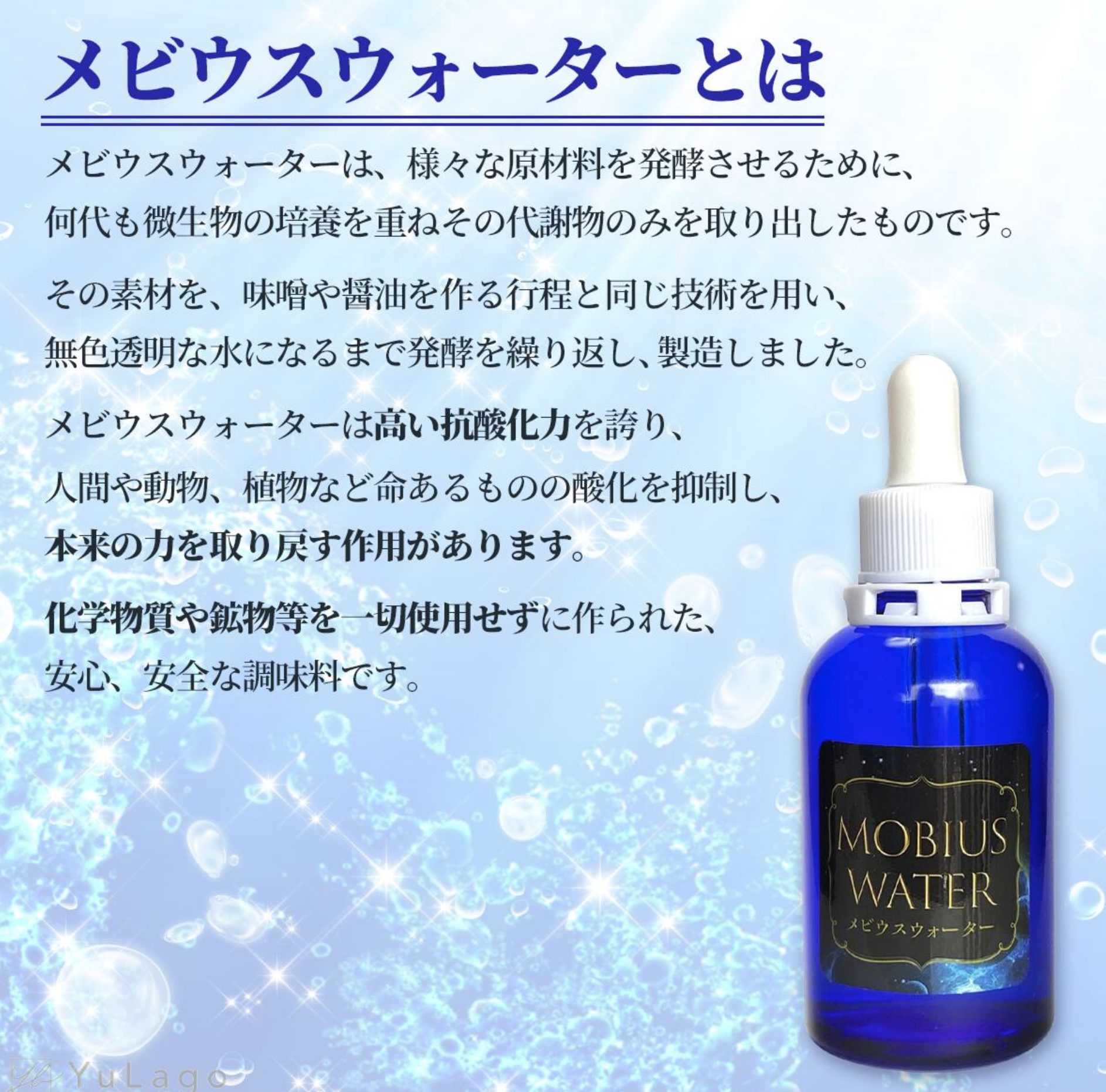 動物や、人間、植物まで使えますメビウスウォーターは、様々な原材料を発酵させるために働いた微生物を何代も培養を重ね、 その代謝物のみを取り出した物です。 その素材を、日本人の慣れ親しんだ味噌・醤油・酒を作る工程と同じ技術を用い、 無色透明な水(ミネラル化さらに無機化)になるまで何度も醸造発酵を繰り返し、製造したものです。